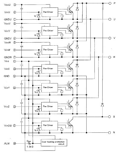 7MBP150RA060 absolute maximum ratings: (1)DC bus voltage, VDC: 450V; (2)DC bus voltage (surge), VDC(surge): 500V; (3)DC bus voltage (short operating), VSC: 200 to 400V; (4)Collector-Emitter voltage, VCES: 600V; (5)DB Reverse voltage, VR: 600V; (6)Junction temperature: 150℃; (7)Input voltage of power supply for Pre-Driver: 20V; (8)Input signal voltage: 0V; (9)Input signal current: 1mA; (10)Alarm signal voltage: 0V; (11)Storage temperature: -40 to 125℃; (12)Operating case temperature: -20 to 100℃; (13)Isolating voltage (Case-Terminal): AC2.5 kV.